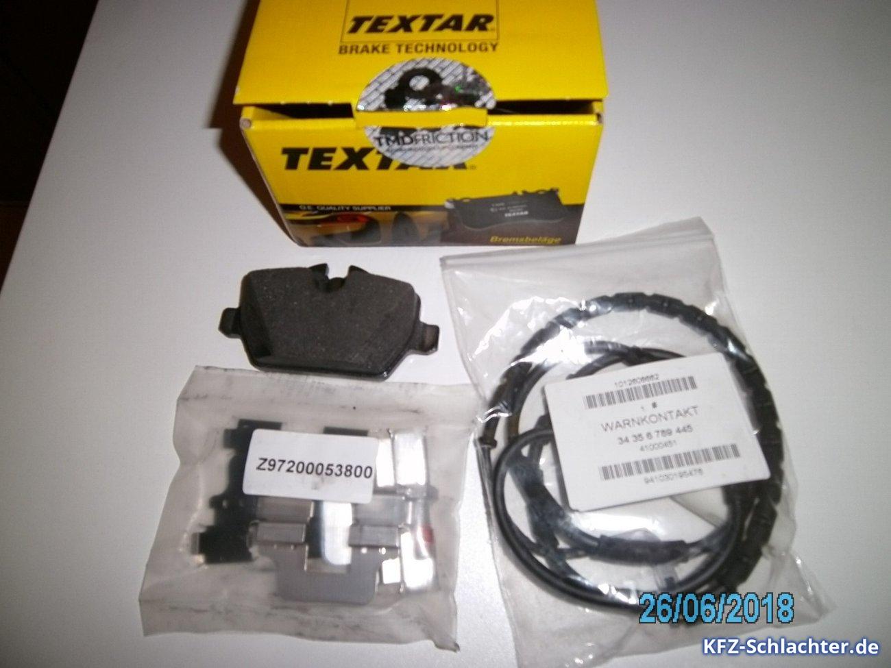 Verkaufe neue Bremsbeläge f. BMW 118i für hinten von Textar plus Zubehör und Verschleißanzeiger neu, passend für Schlüsselnummer 0005/ARG000041 und vergleichbare E81, E87, E88, E82, 3ER, E90, E91, E92, E93